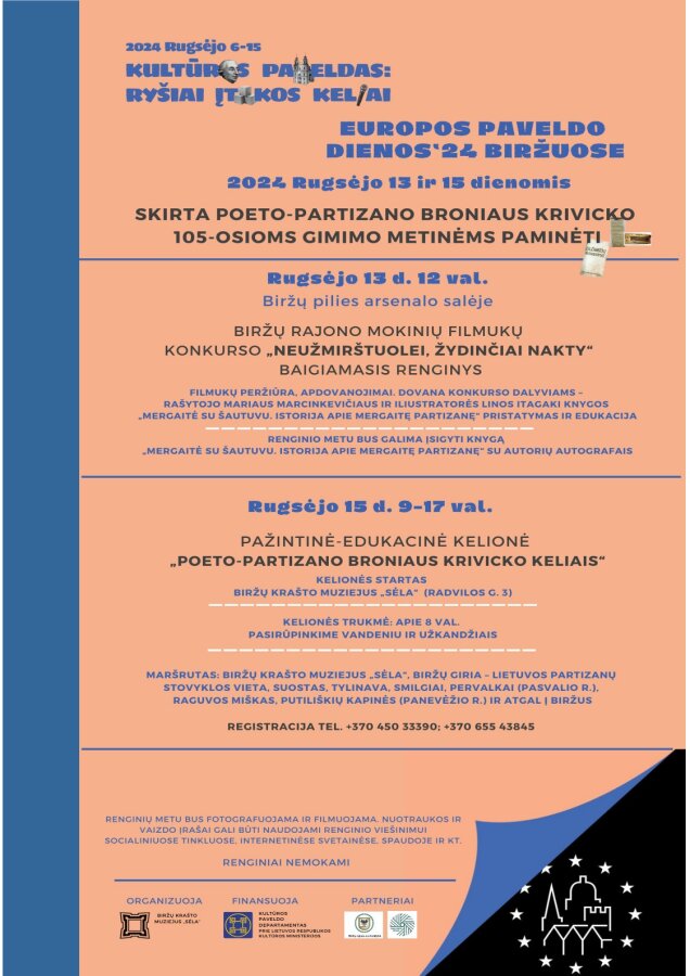 Biržų rajono mokinių filmukų konkursas „Neužmirštuolei, žydinčiai nakty“, skirtas poeto-partizano Broniaus Krivicko 105-osioms gimimo metinėms paminėti. Daugiau informacijos rasite: Europos Paveldo Dienos