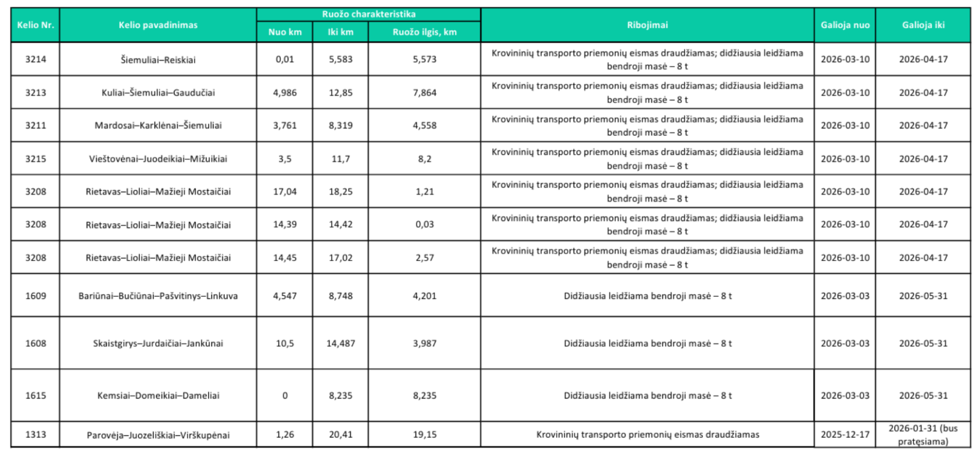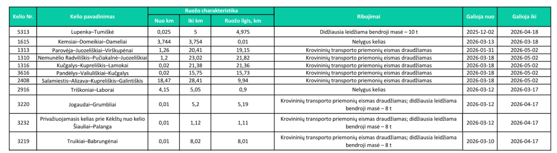 Ribojimai įvedami remiantis nuolatine kelių būklės stebėsena ir rizikos vertinimu, taikomi tik jautriausiuose ruožuose ir tik kritiniu laikotarpiu. Pasikeitus sąlygoms ir atsistačius kelių laikomajai gebai, ribojimai bus operatyviai peržiūrimi ir, esant tinkamoms sąlygoms, atšaukiami.